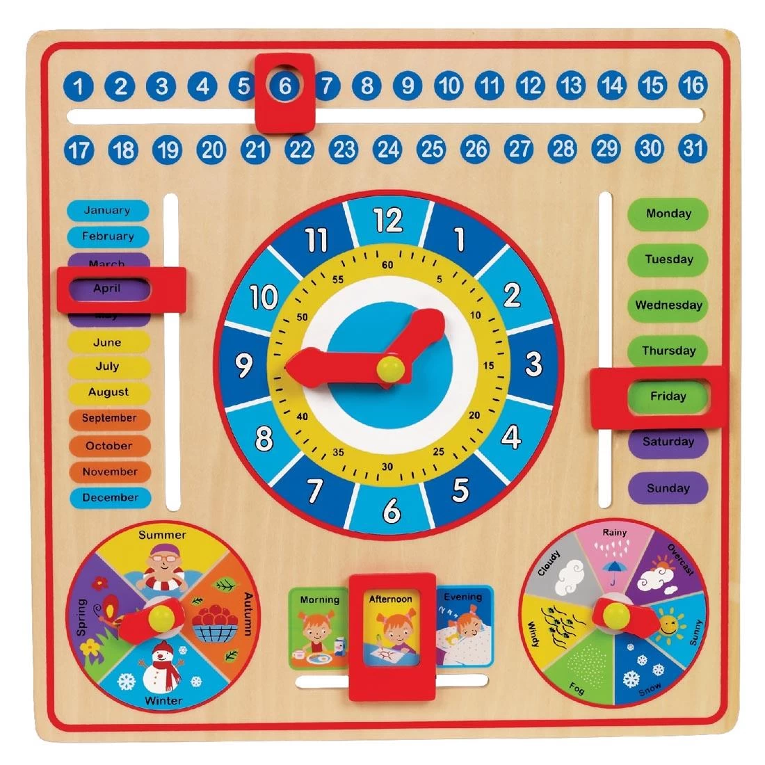 What will today bring? Will it be rainy or sunny? Is it Monday? What time is it? All-in-one teaching tool helps children learn about seasons, weather, days of the week, months of the year and telling time. Wooden board features dials, sliding bars and moveable clock hands for interactive, educational fun. Can easily be hung on a wall. Measures 12 x 12 x 1/2″. For ages 3 and up.