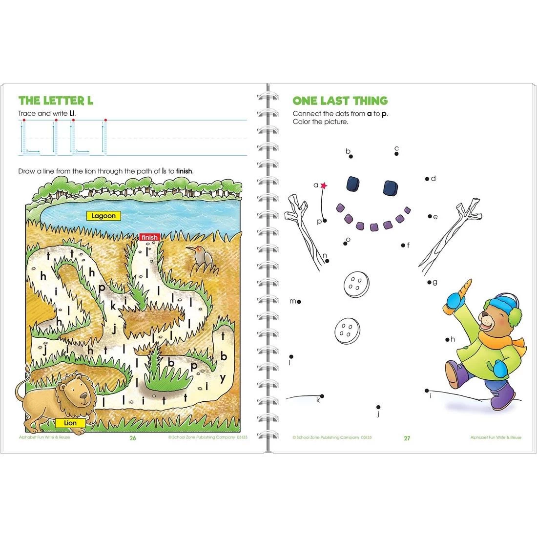 Introduce little learners to the alphabet and give them lots of playful practice in perfecting their skills with letter-tracing, mazes, hidden pictures and dot-to-dots. Charming characters and bold, inviting colors can help motivate reluctant learners, and they will develop focus, observation, and problem-solving abilities, too. Kids can write, wipe away, and redo the activities in the book again and again with the included marker. 52 thick-coated, laminated activity pages are spiral-bound, so the book lays flat for use. Includes a sheet of colorful reward stickers. For ages 4-6.
