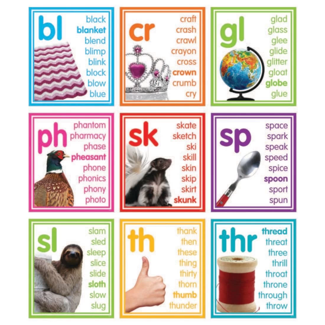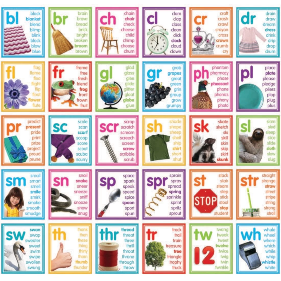 Use these colorful photo cards to teach the spelling-sound correspondence of common consonant blends and digraphs. Each card features a different blend or diagraph, with several example words. One example word is in bold, and corresponds to the picture on the card. Use during guided practice in small groups or as a class, and display as a reference for early readers to use on a daily basis. 30 cards in all, each measures 7-3/4 x 9″. Made from 12pt, durable cardstock with UV coating on one side.