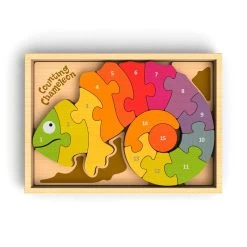 The Counting Chameleon puzzle teaches numbers 1 to 15 in two languages! The front side of each piece features a numeral, while the back has the numeral written in both English and Spanish. Chunky pieces mean the colorful chameleon can even stand up! Made from sustainable rubberwood and finished with water-based stains. Includes a beech wood box for storage and display. Measures approximately 10-1/4 x 7-1/4″, including storage box. For ages 3 and up.