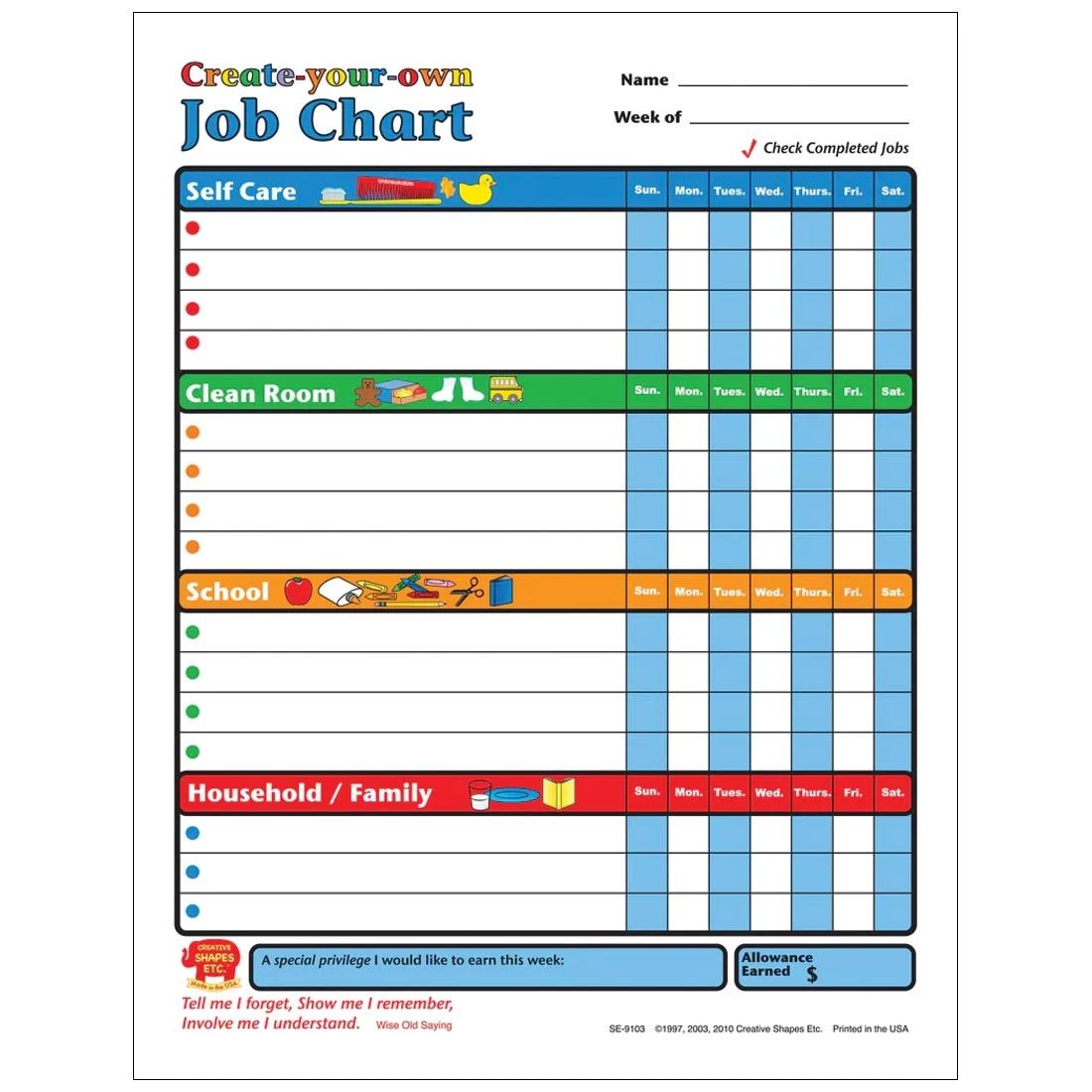 Help children learn about responsibility, planning and self-discipline with a weekly job chart. Categorize jobs in 4 different areas: self-care, clean room, school and household/family. Each category features blank spaces for writing in specific jobs. Simply place a checkmark, sticker or stamp under each day the task is completed. When the week is through, you can offer positive reinforcement – allowance money, a special treat, or something else that works for your family. Includes 50 sheets, each measures 8-1/2 x 11″.