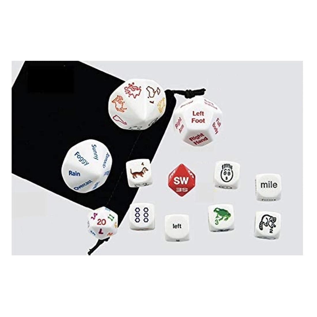 Use these dice and your imagination to create a story. Use all the dice, or just a few; tell the story by yourself or have each person add their own part – there are tons of ways to play. Set features 12 different dice, in various shapes and sizes, that feature more than 100 different icons. Dice feature continents, animals, parts of the body, emotions, weather conditions, numbers and more. Comes with a bag for easy storage.
