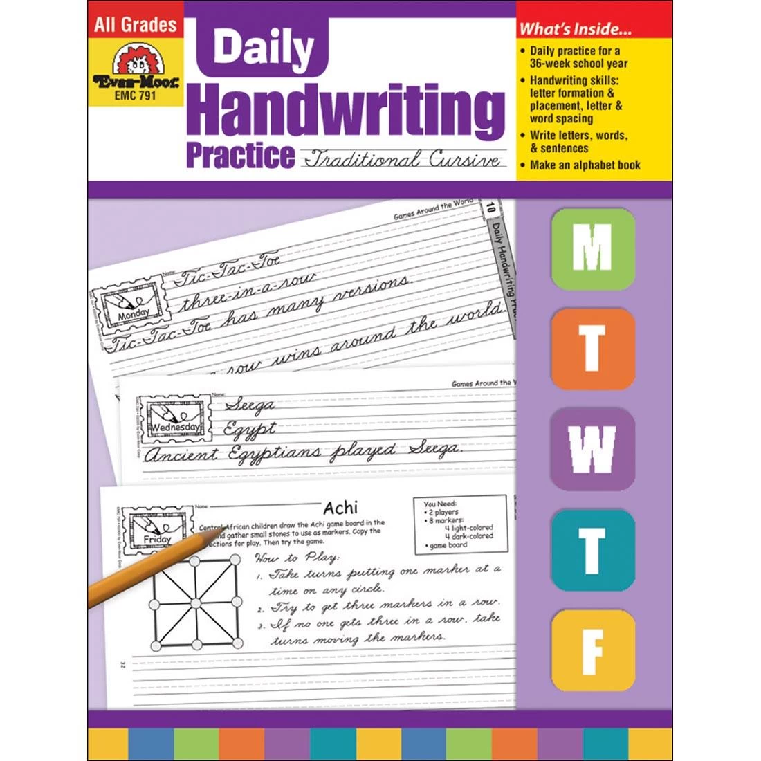 Daily Handwriting Practice, Traditional Cursive is more than just a handwriting book; it is a learning tool that helps developing young minds practice basic skills in an interesting and unique way. For example, on the topic “What Is Work?” students learn about simple tools and the physics applied in using them. Students write letters, words and sentences about a variety of content-area topics appropriate for the classroom. Monday through Thursday, the weekly subjects for writing exercises range from famous inventors to famous quotations, and from amazing hunters to the water cycle. Curriculum topics addressed include the alphabet, capital letters, rhyming words, months of the year, days of the week, world alphabets, geography, facts, synonyms, nonsense rhymes, color words, alliteration, U.S. presidents, simple machines, math, rhyming words and prefixes and suffixes. On Friday, a full-page exercise draws the topic to a close by reviewing what was learned earlier that week. This book is a useful and effective teaching tool because each letter is introduced and practiced before students are asked to use it. Skills reinforced that help keep handwriting legible include: correct letter formation, letter placement, spacing between letters and spacing between words. 112 pages. Grades 1-6.