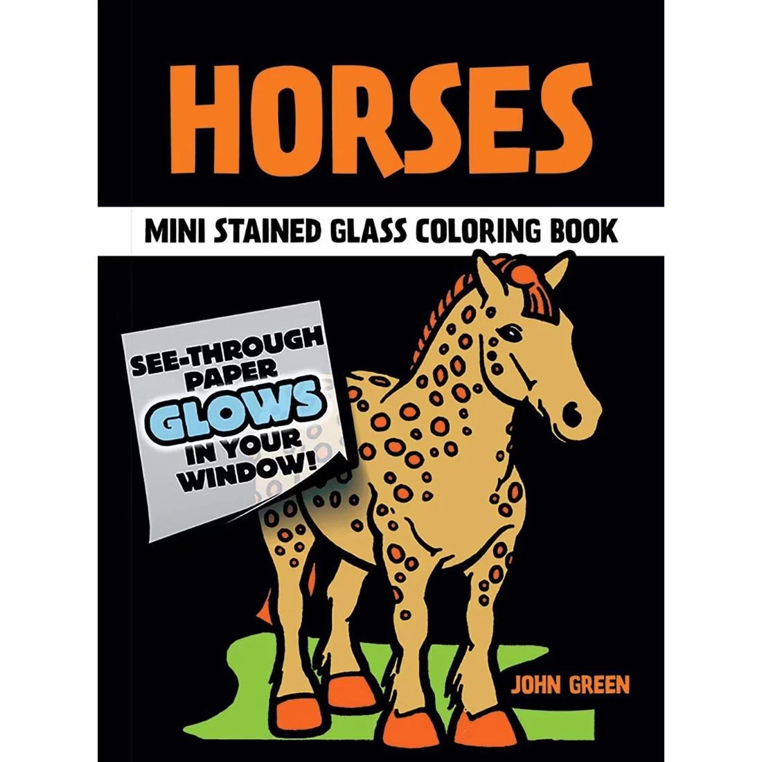 The pages in this book are printed on both sides of translucent paper. The images create a stained glass effect when colored and placed against a window or other bright light source. Pages can be colored with crayon, felt-tip pen, acrylics, watercolor, tempera or oil paints. Or, colored tissue can be applied to the transparent surface. Color both sides for the most dramatic results. Horses included are Thoroughbred, Arabian, Pinto, Mustang, Percheron, Shetland Pony, Clydesdale and Palomino. 8 pages. Paperback measures 4-3/16 x 5-5/8″.