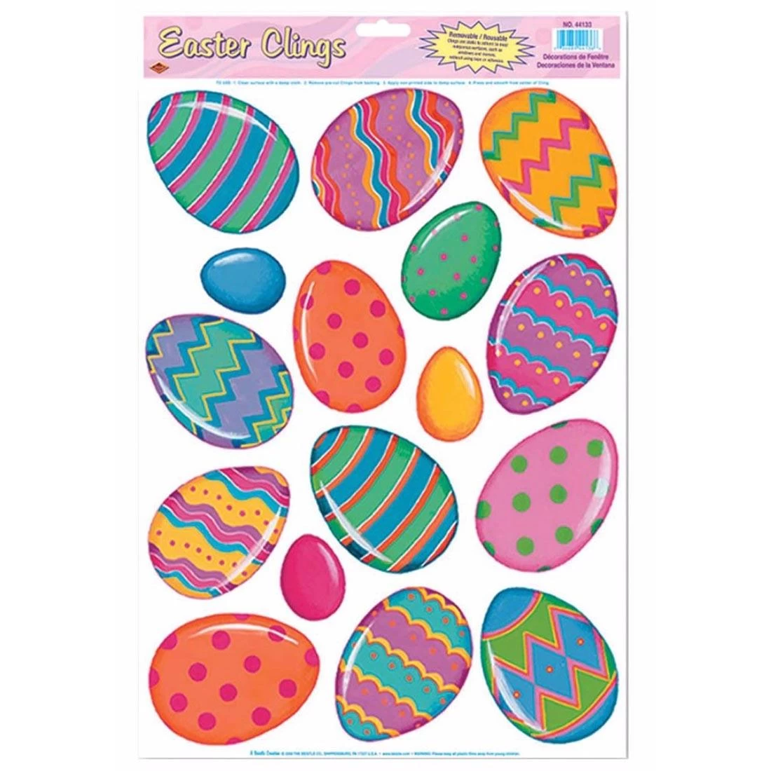 Decorate for Easter with these colorful Easter egg clings. Simply peel from the backing paper and apply to windows and mirrors. Repositionable and removable. 16 clings.