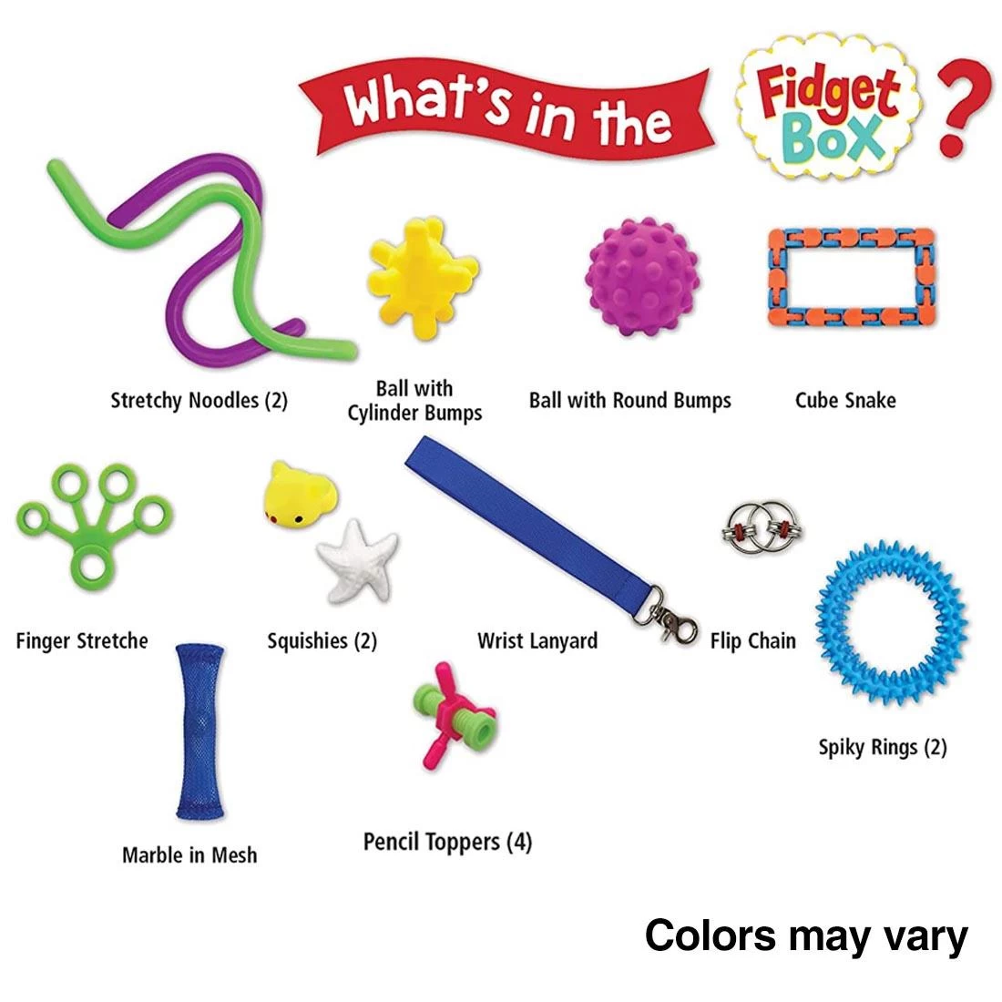 Fidget tools help reduce stress and anxiety, plus they are great for improving fine motor skills, coordination and dexterity. They can also aid in focus, attention and staying calm, especially for students who have extra energy and hyperactivity. Fidget box features 18 assorted sensory fidget tools – quiet devices that can be stretched, pulled, twisted and squeezed. Includes 2 spiky rings, 2 stretchy noodles, 1 ball with cylinder bumps, 1 ball with round bumps, 2 cube snakes, 1 marble in mesh, 1 finger stretcher, 2 squishies, 1 wrist lanyard, 1 flip chain and 4 pencil toppers. For ages 4 and up. Colors of items may vary.
