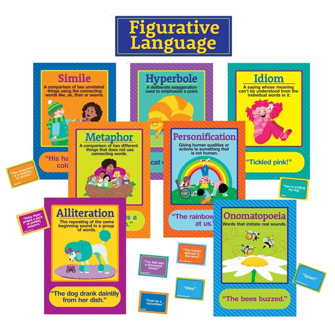 Help students learn and understand figurative language with this bulletin board set. Covers seven types of figurative language: simile, metaphor, idiom, hyperbole, alliteration, onomatopoeia and personification. Features 7 colorful 12×17″ posters, each explaining one type of figurative language, 8 mini signs with additional example phrases and a teacher’s resource guide. Made from 14pt cardstock that is coated on one side.