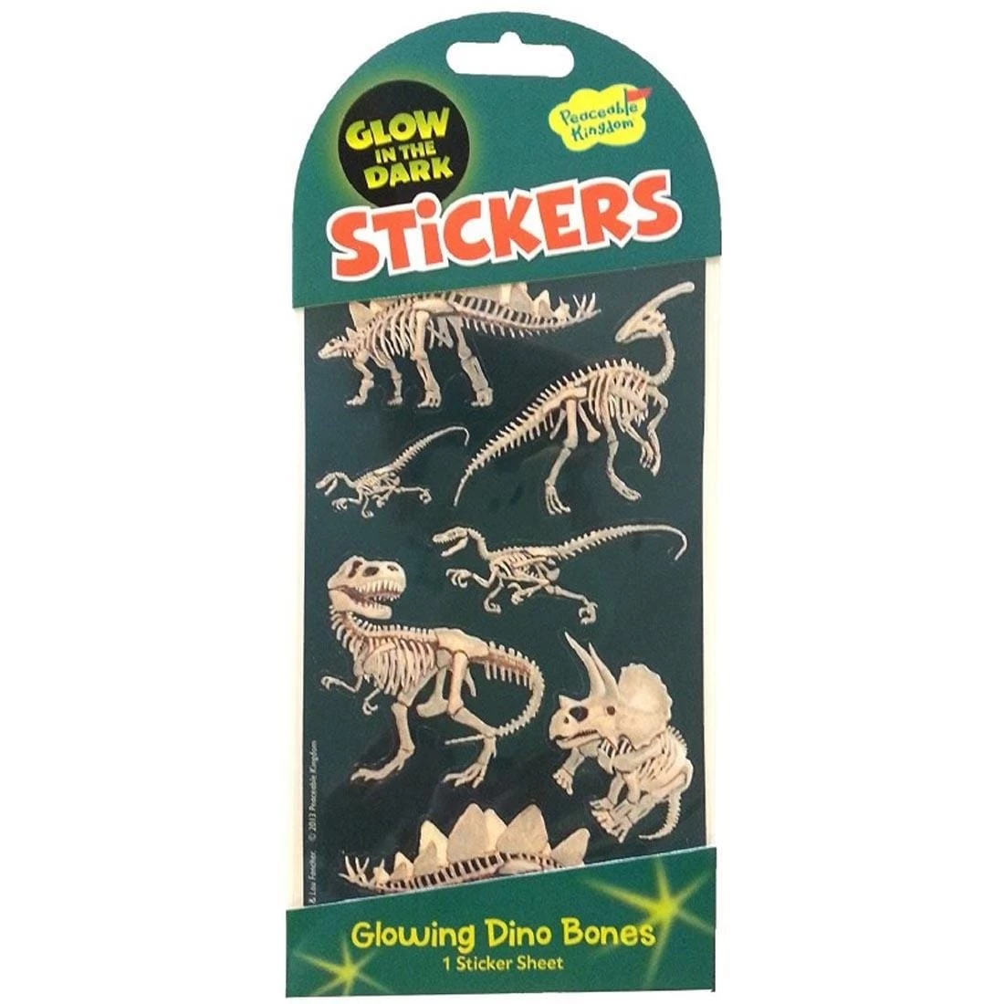 A terrific set of stickers for any dinosaur fan. Stickers feature the skeletons of various dinosaurs, and the bones glow in the dark! Package includes one sheet of acid-free stickers. Sizes vary; tallest sticker is 2-1/4″, widest sticker is 2-3/4″.