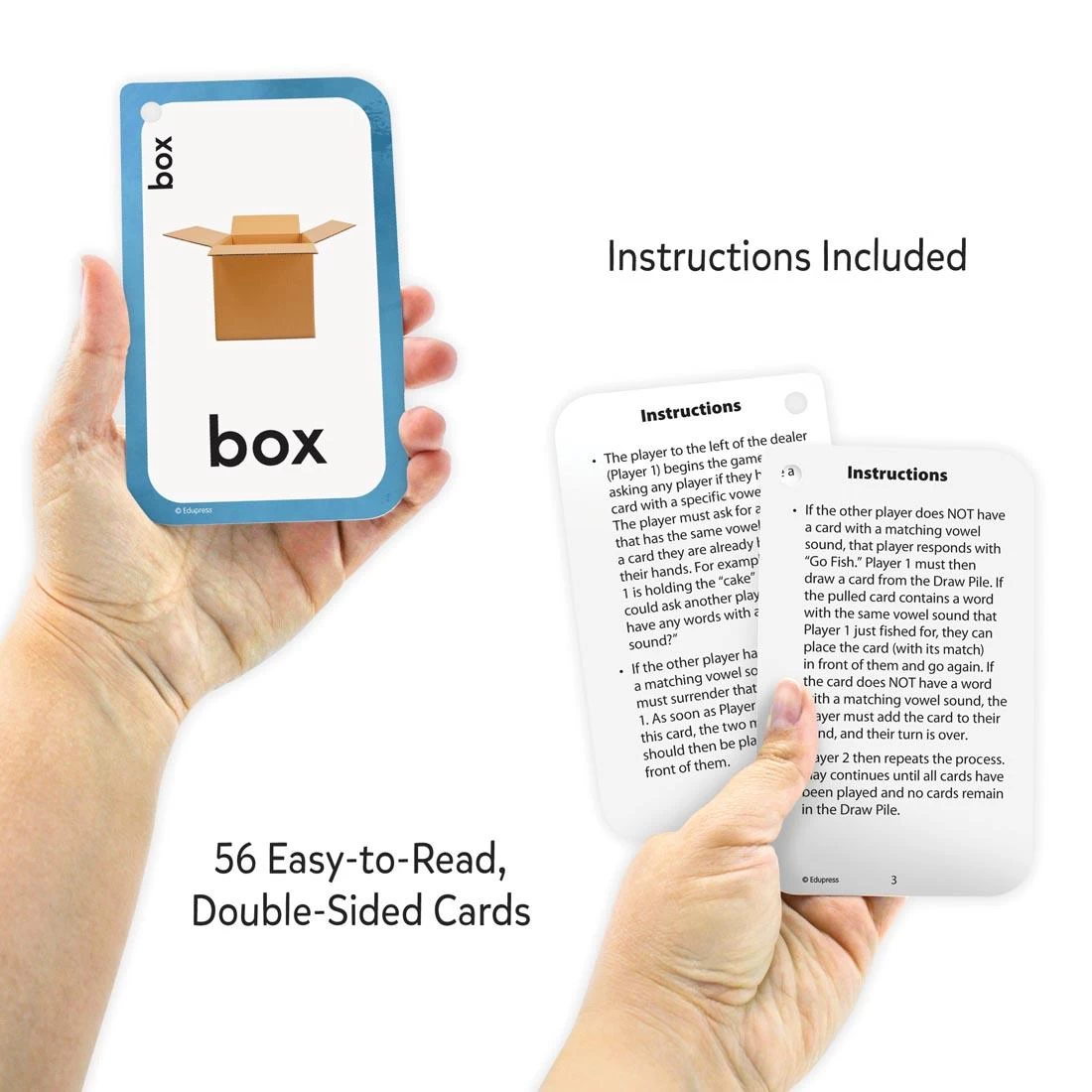 The classic game of Go Fish, with a twist. Players match words with similar vowel sounds. Includes long and short vowels. Durable cards have a hole in the top corner so they can be added to a book ring to help with organization and storage. Comes with instructions and tips for the teacher or parent, suggested activities, and additional blank cards. 56 playing cards, each measures 3-1/8 x 5-1/8″. For 2-6 players, ages 5 and up.