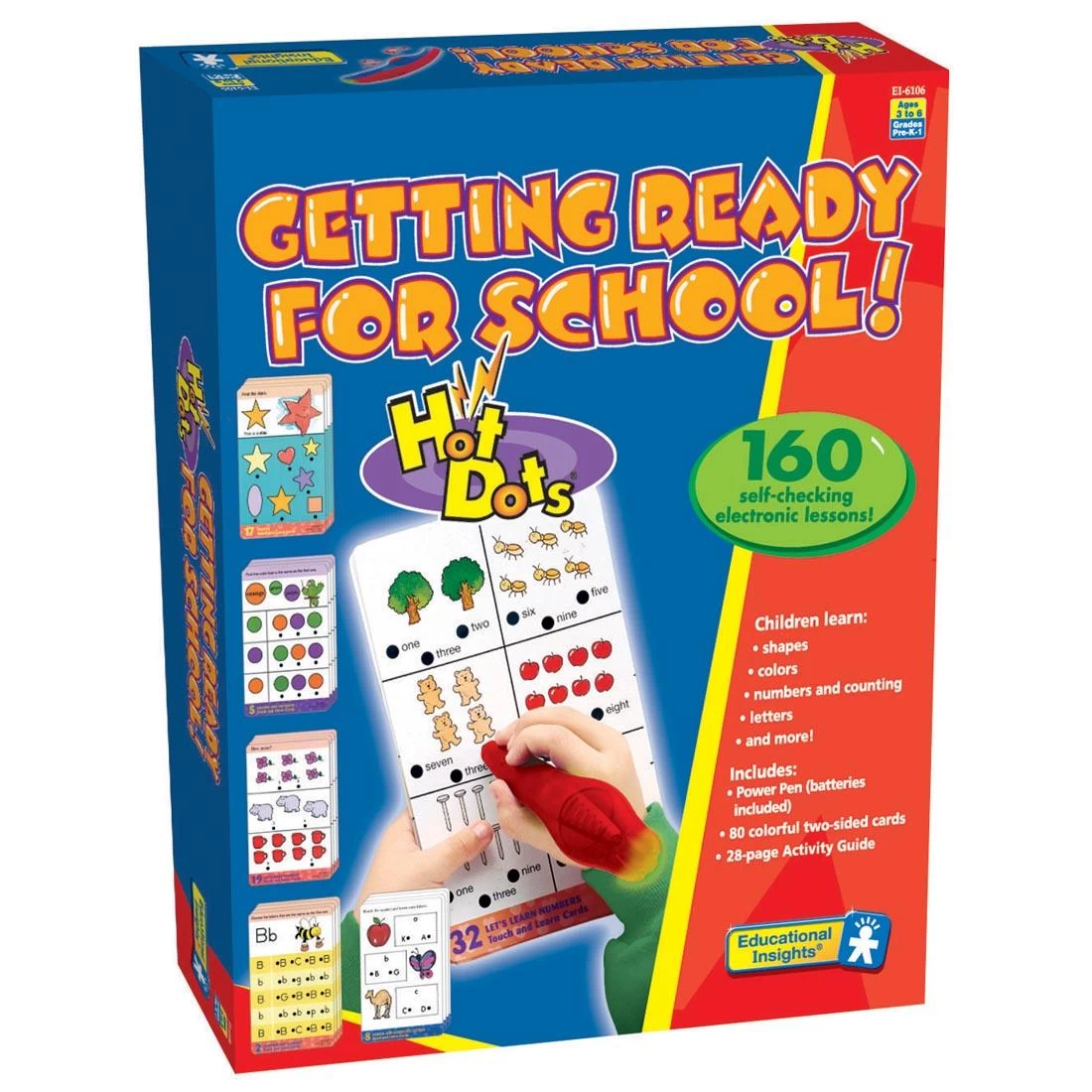 This self-checking electronic quiz card set features the amazing Talking Hot Dots Pen. Touch the pen to a dot and it responds instantly with lights and sounds. Answer correctly and the pen glows green. Select an incorrect answer and it glows red. Set includes one pen and 80 two-sided illustrated lesson cards. Lesson cards feature early learning skills in five progressive categories that teach colors, patterns, shapes, numbers, letters and much more. Grades PreK+.