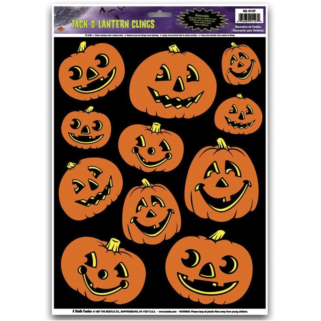 An easy way to decorate for fall or Halloween; simply attach the clings to windows or mirrors. Package includes 11 jack-o-lantern clings. Removable and repositionable.