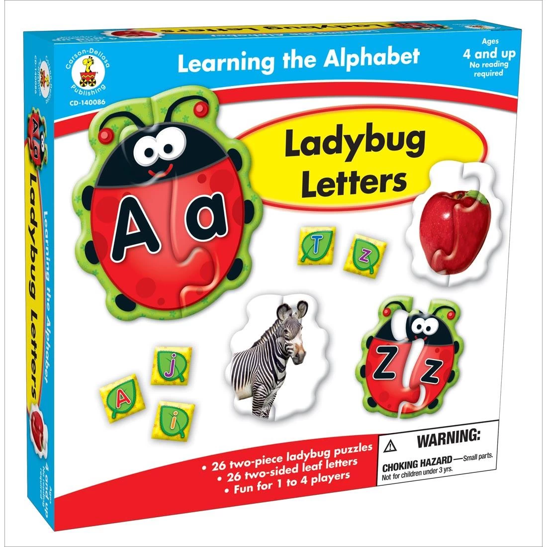 Learn the alphabet with ladybug puzzles. Each correctly assembled two-piece ladybug results in a letter match. Turn the ladybug over to see a completed photograph of something that begins with that letter. Included are 26 ladybugs, 26 two-sided leaf letters, and a resource guide. No reading is required to play three different games. For 1 to 4 players, ages 4 and up.