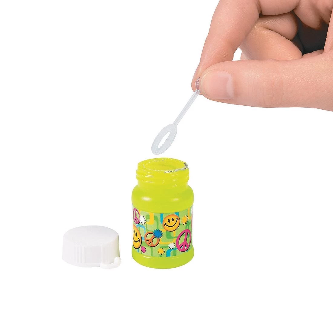 Have a “groovy” time with these mini bubble bottles, with wrapping that brings back a 1960s vibe. Great for adding to party favor bags, reward treasure chests and more. Each 2″ bottle has 1 oz. of bubble liquid and a bubble wand. 4 bottles per package in assorted colors.