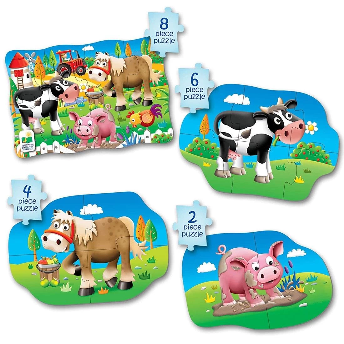 Terrific starter puzzles will help little hands develop fine motor skills. Contains four colorful puzzles so your toddler can discover friendly farm animals. Puzzles progress from 2 pieces to 4 pieces, followed by 6 pieces and 8 pieces, giving your child the opportunity to grow and develop with the set. 8-piece puzzle brings the animals from the other three puzzles together in one scene. Each puzzle measures approximately 12-1/2 x 8-1/2″. For ages 2 and up.