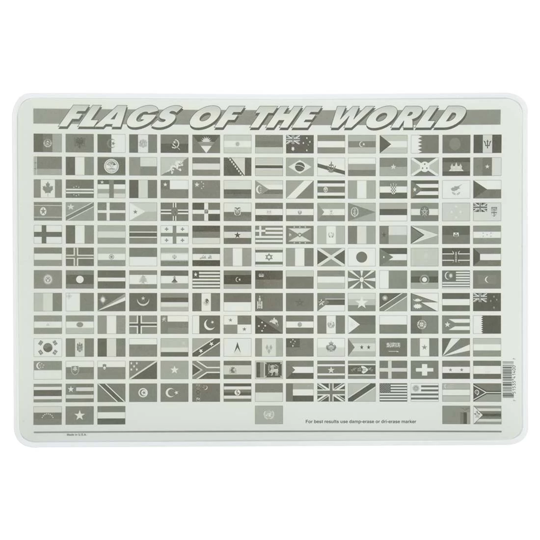 A delightful way for children to master new subjects and for adults to brush up on old ones! The front of the placemat is brightly colored, and laminated with a non-glare laminate. It features the flags of 186 countries, plus the United Nations flag. The black & white back features the flags covered on the front without information, so children can fill in the correct information under each picture with a wipe-off marker. Laminated surface wipes clean with a damp cloth. 17-1/2 x 12″.