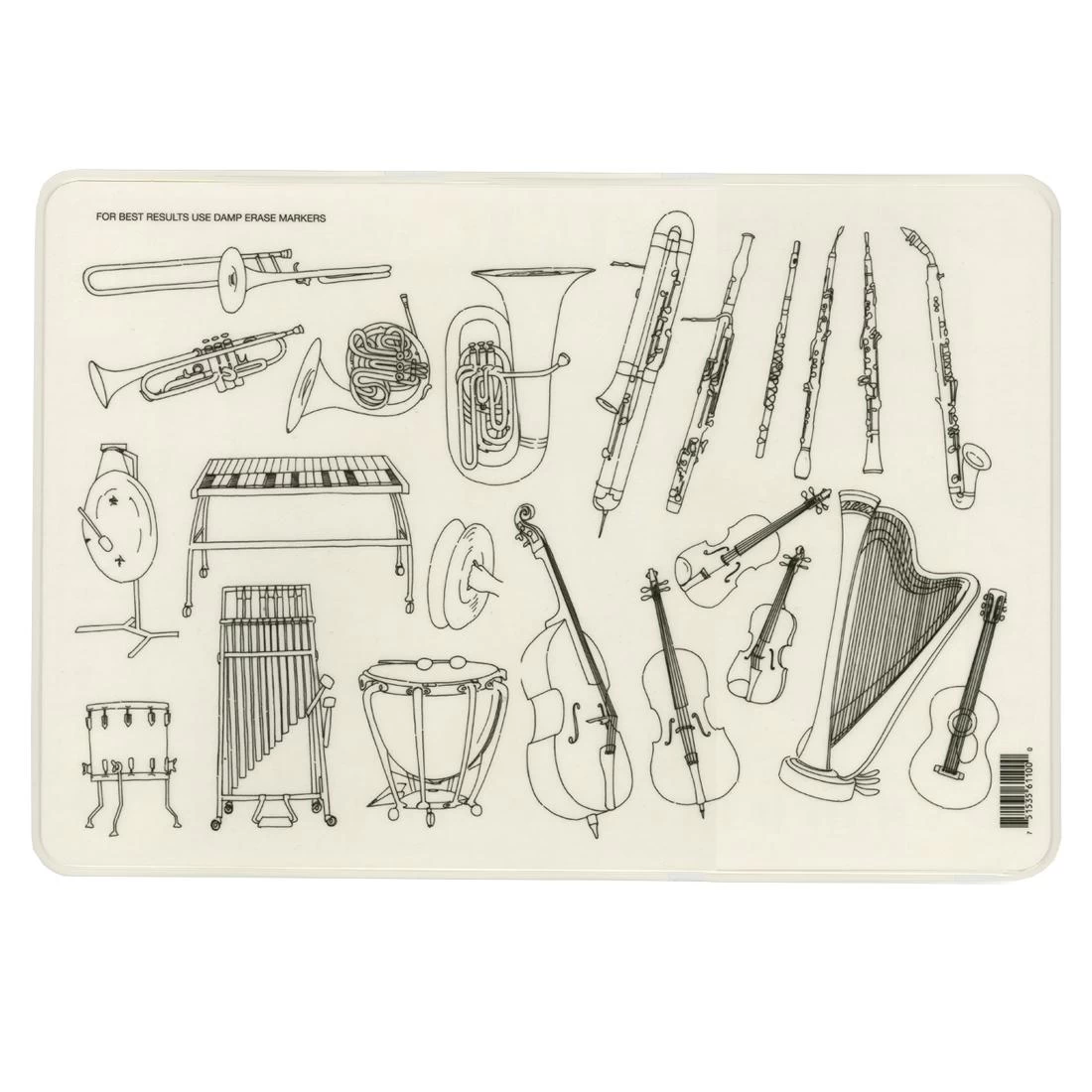 A delightful way for children to master new subjects and for adults to brush up on old ones! The front of the placemat is brightly colored, and laminated with a non-glare laminate. It features brass, percussion, strings, and woodwind instruments, as well as treble and bass clefs, notes, rests, and a piano keyboard. The black & white back features instruments for identification, so children can fill in the correct information under each picture with a wipe-off marker. Laminated surface wipes clean with a damp cloth. 17-1/2 x 12″.