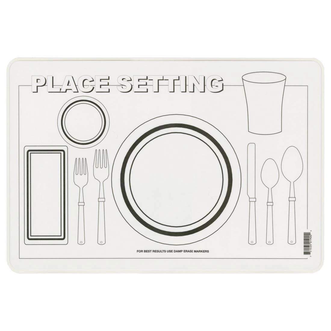 Place Setting shows proper placement on table. Study on one side and practice on the other. Use erasable markers on reverse side. Washable for fun and practice. Measures 12 x 17-1/2″.