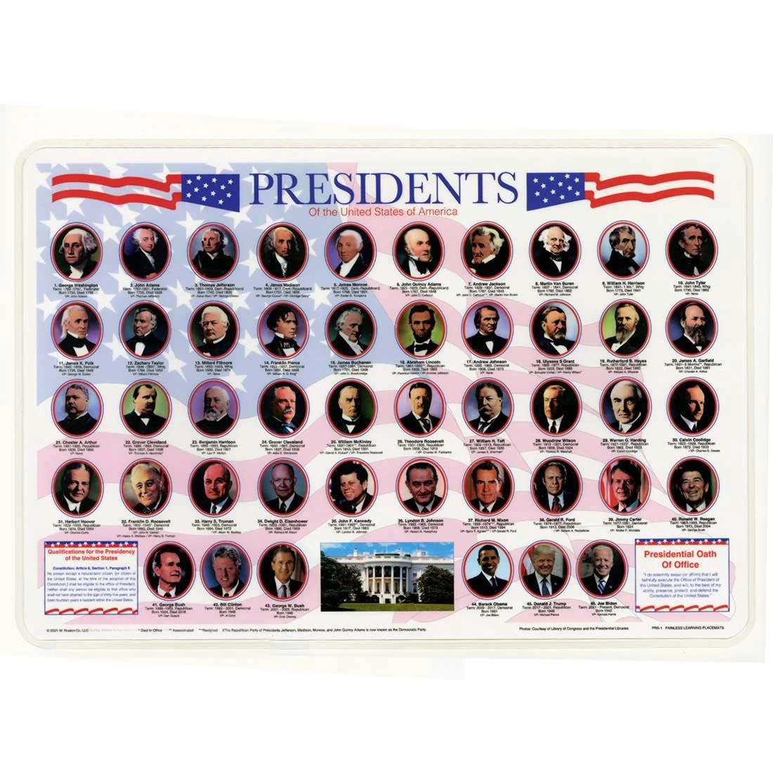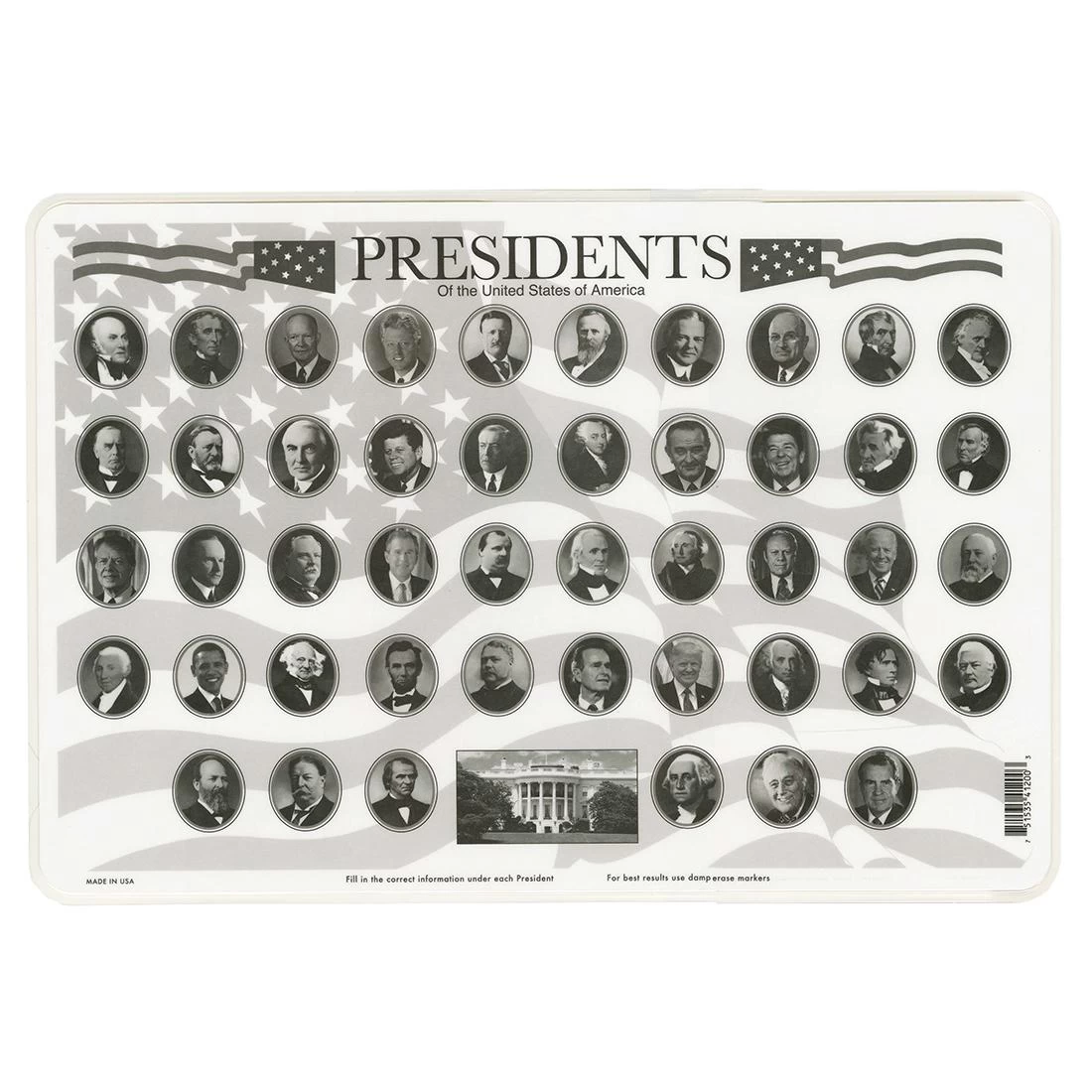 A delightful way for children to master new subjects and for adults to brush up on old ones! The front of the placemat is brightly colored, and laminated with a non-glare laminate. Features a portrait of all the US presidents, with their dates of birth, death (if applicable), dates in office, and political affiliation. The black & white back features exercises based on the front, so children can fill in the correct information under each picture with a wipe-off marker. Laminated surface wipes clean with a damp cloth. Measures 17-1/2 x 12″.