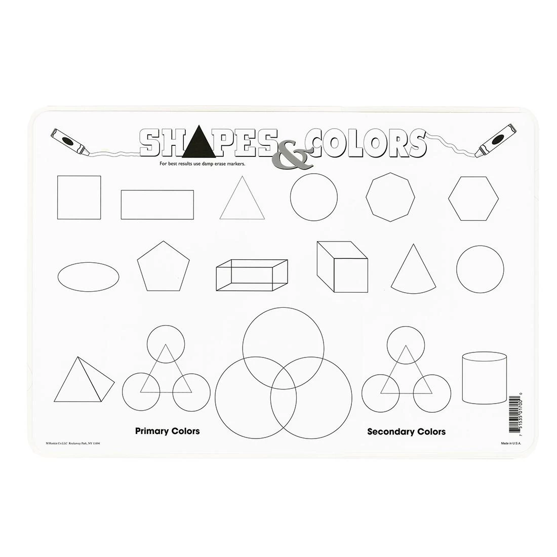 A delightful way for children to master new subjects and for adults to brush up on old ones! The front of the placemat is brightly colored, and laminated with a non-glare laminate. It features two and three-dimensional shapes, a color map, and primary and secondary color mixes. The black & white back shows unlabeled pictures, so children can fill in the correct information with a wipe-off marker. Laminated surface wipes clean with a damp cloth. 17-1/2 x 12″.