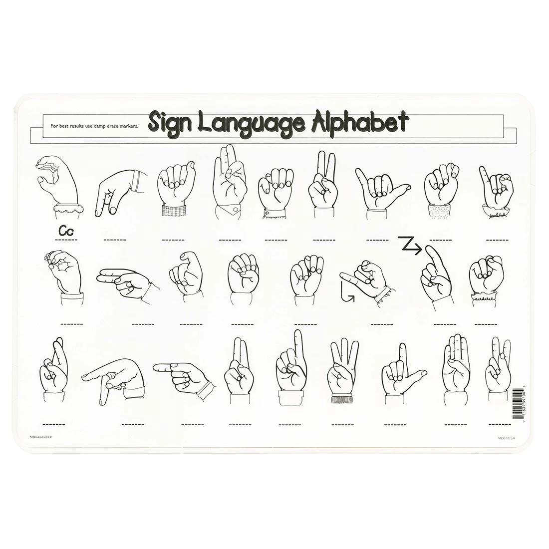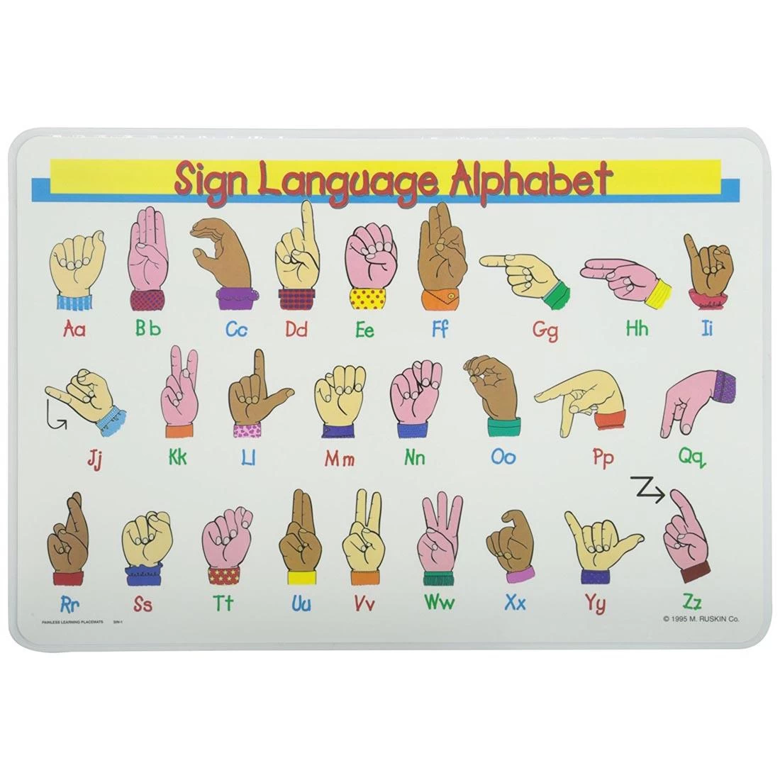 A delightful way for children to master new subjects and for adults to brush up on old ones! The front of the placemat is brightly colored, and laminated with a non-glare laminate. It features the Sign Language Alphabet, A to Z. The black & white back features each alphabet symbol in random order, without letter designations, so children can fill in the correct answer with a wipe-off marker. Laminated surface wipes clean with a damp cloth. 17-1/2 x 12″.