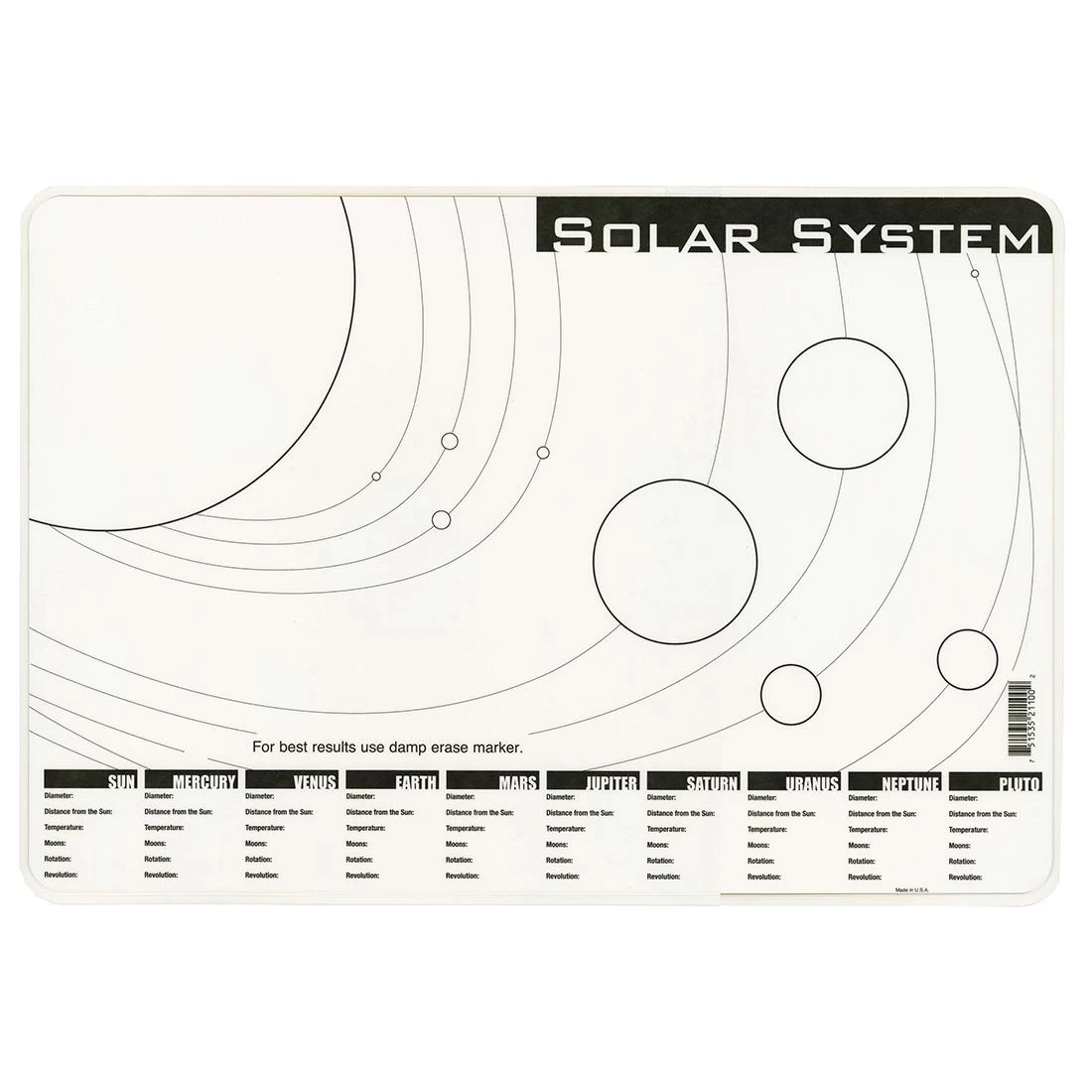 A delightful way for children to master new subjects and for adults to brush up on old ones! The front of the placemat is brightly colored, and laminated with a non-glare laminate. It features the solar system, from the Sun to Pluto. It includes facts about the planets covering size, temperature, distance from the Sun, moons, rotation, and revolution. The black & white back is identical to the front, so children can fill in the correct information under each picture with a wipe-off marker. Laminated surface wipes clean with a damp cloth. 17-1/2 x 12″.