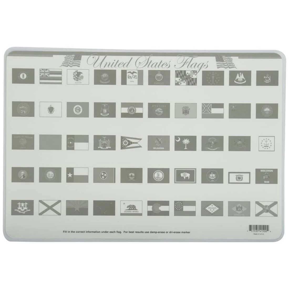 A delightful way for children to master new subjects and for adults to brush up on old ones! The front of the placemat is brightly colored, and laminated with a non-glare laminate. It features the flags of the 50 states of the US. The black & white back features the flags without identification, so children can fill in the correct information under each picture with a wipe-off marker. Laminated surface wipes clean with a damp cloth. 17-1/2 x 12″.