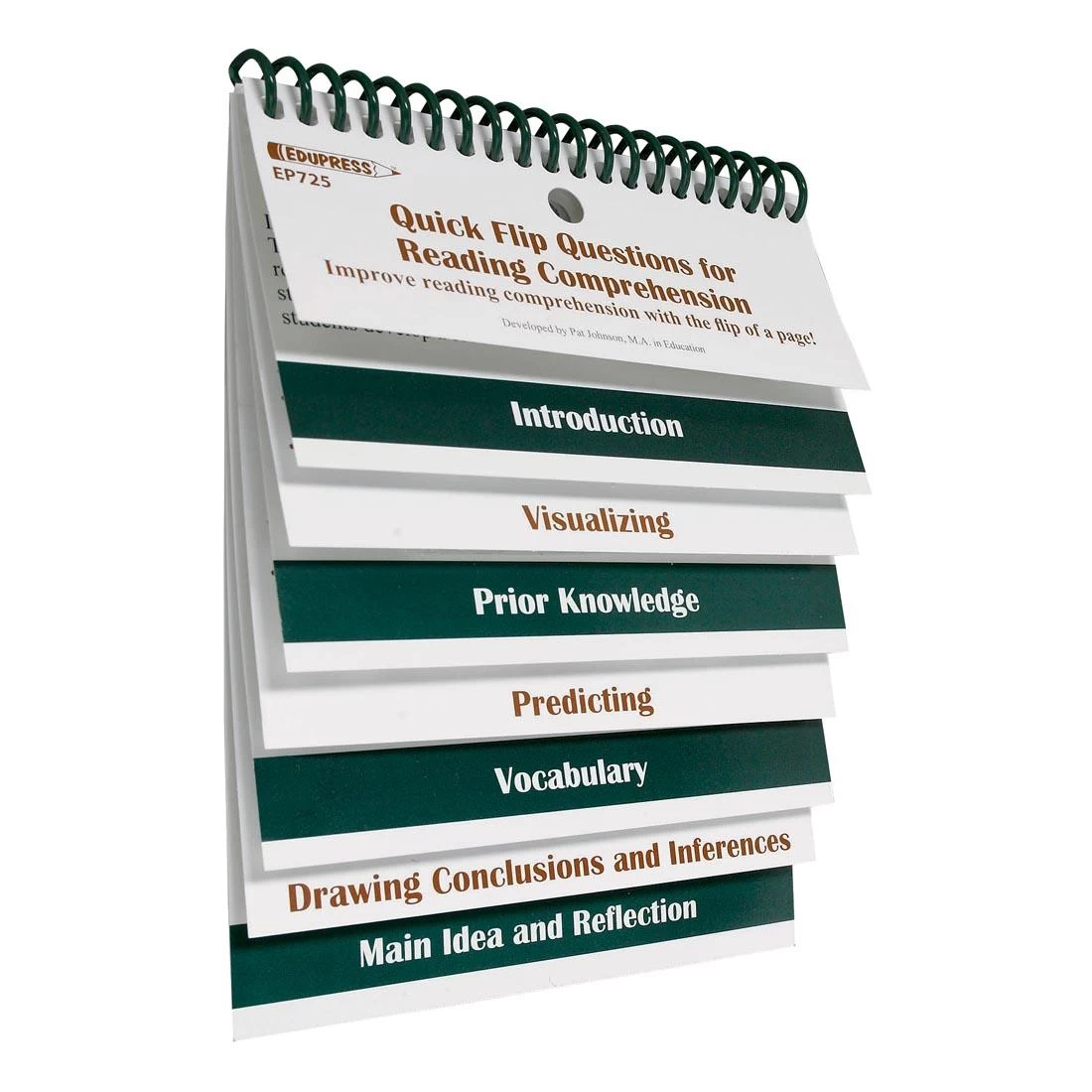 Handheld flip charts make understanding learning theories and planning lessons easy! The convenient format keeps important information and teaching strategies right at hand. 5×6″. Packed with focus questions, this quick flip makes it easy to practice and assess student comprehension. Eight reading comprehension strategies are covered: visualizing, prior knowledge, predicting, vocabulary, drawing conclusions, inferences, main idea and reflection.
