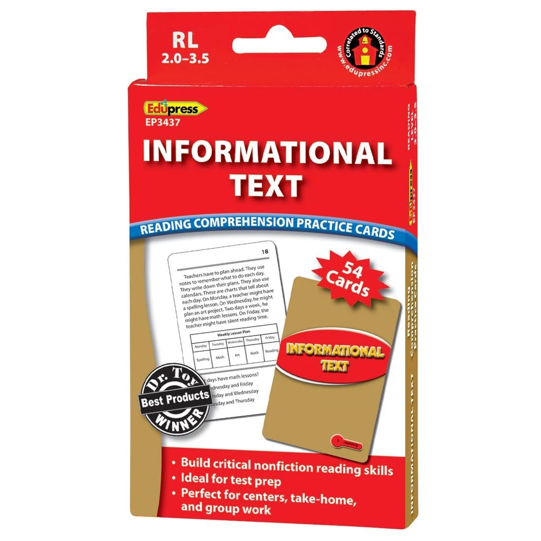 Designed to help students process and understand nonfiction information. Each card features a reading passage and a question, and may also include a graph or picture that students must use to answer the question. Each card has the answer on the back for easy checking. Reading level 2.0 through 3.5; reading level corresponds to grade level. 54 cards, 3-1/2 x 5-1/2″.