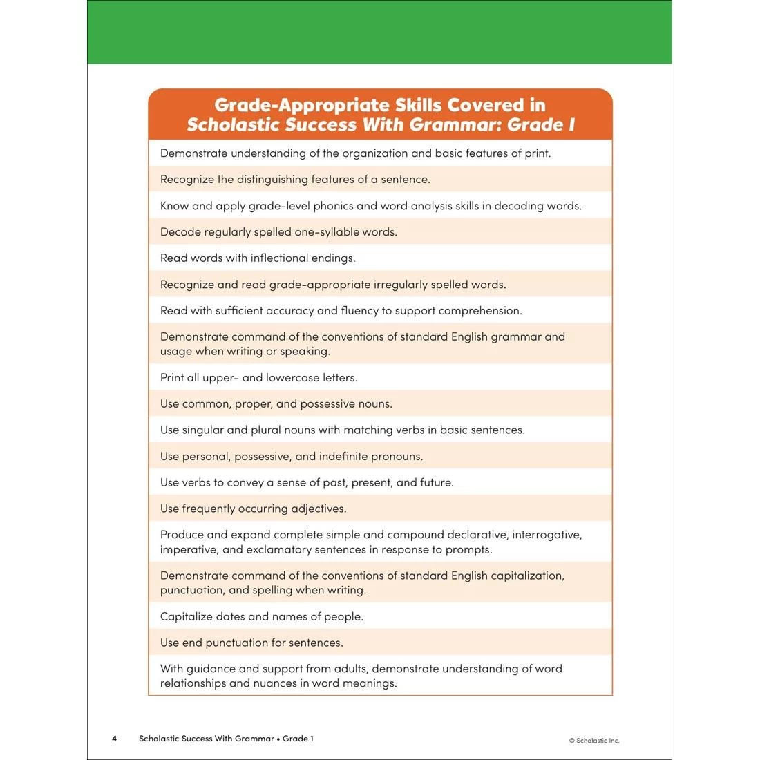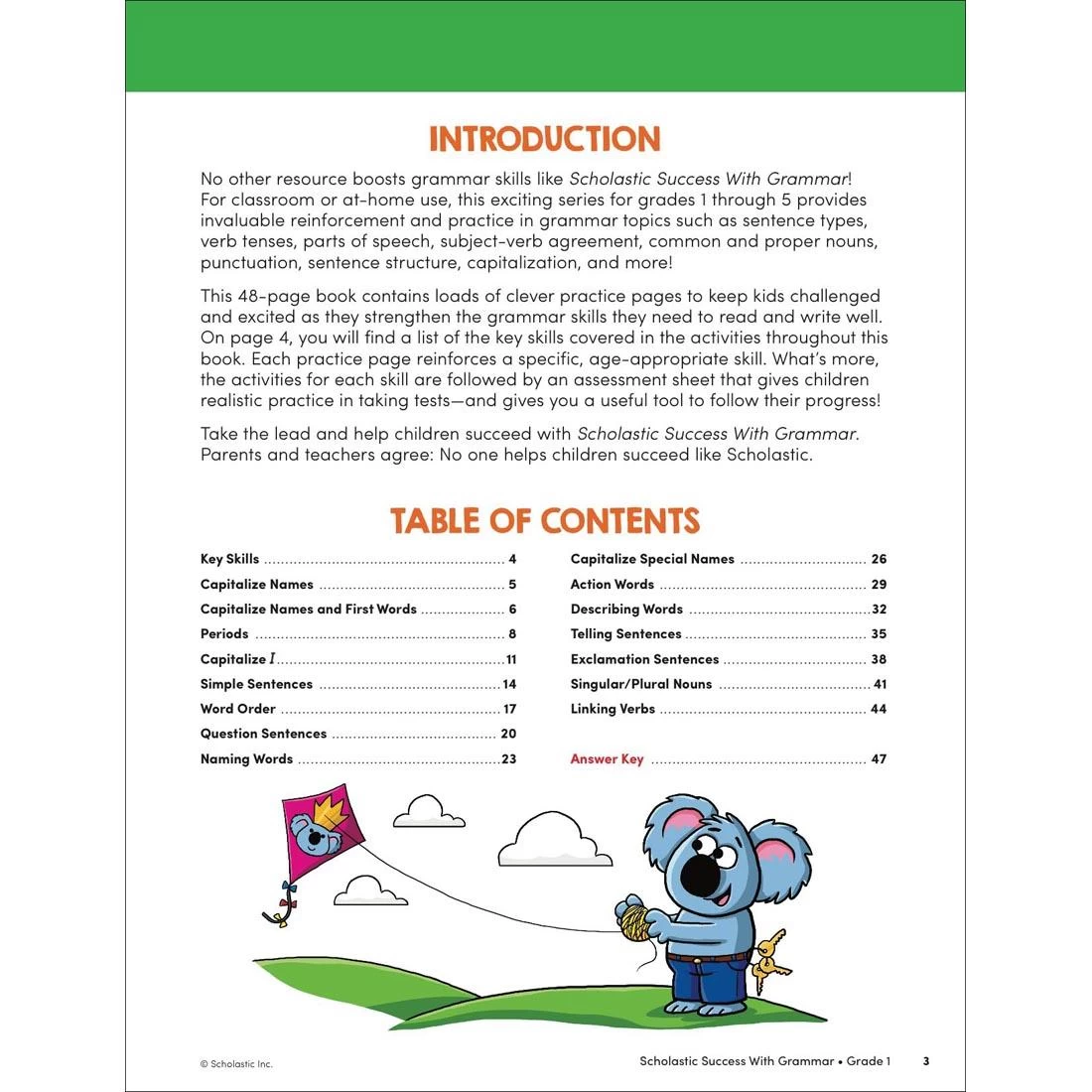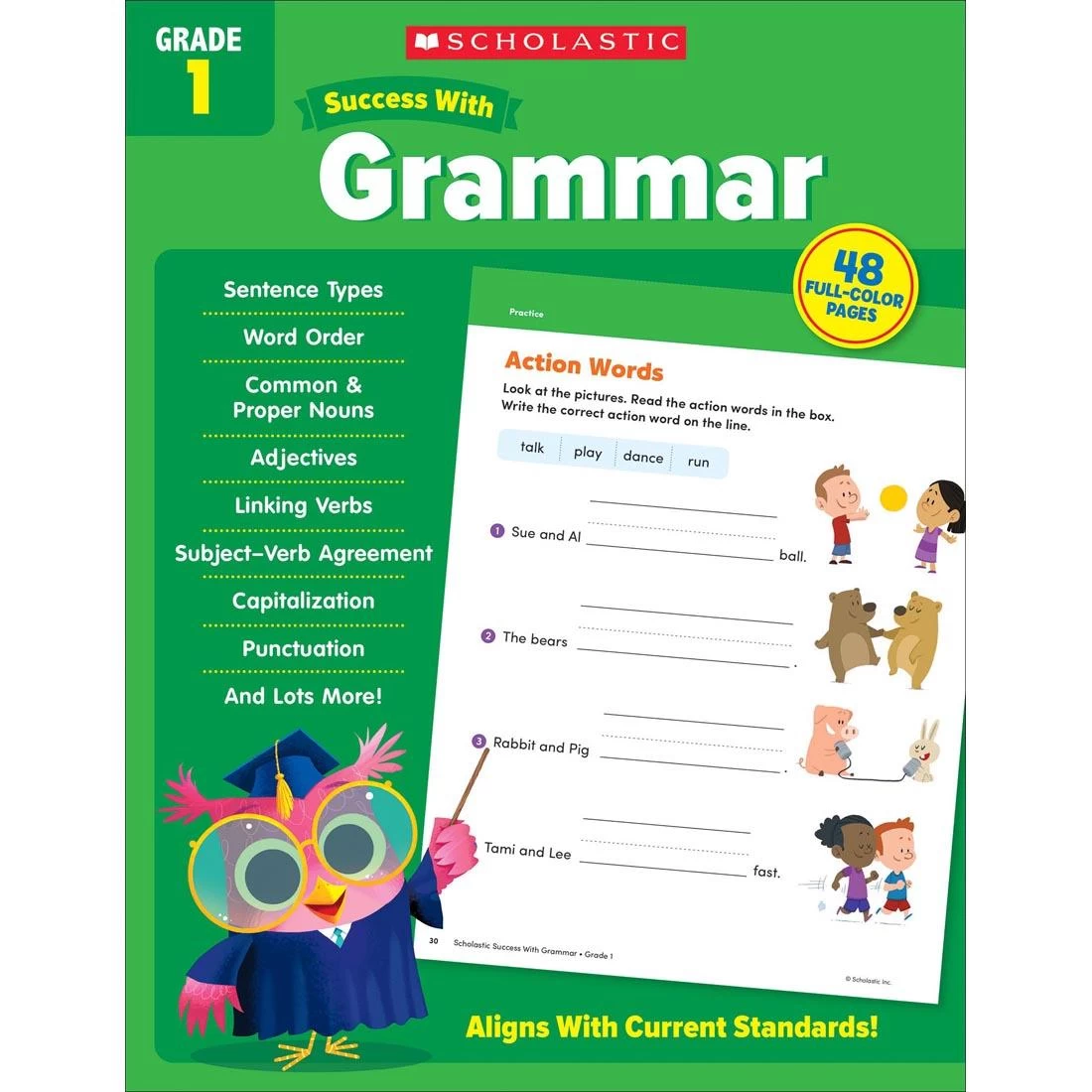 Great for use in the classroom or at home, this workbook includes more than 40 pages of grammar practice for students in first grade. Full-color pages feature engaging activities, plus assessment sheets to help track progress. Covers sentence types; word order; common and proper nouns; adjectives; linking verbs; capitalization; punctuation; and more. 48 pages.
