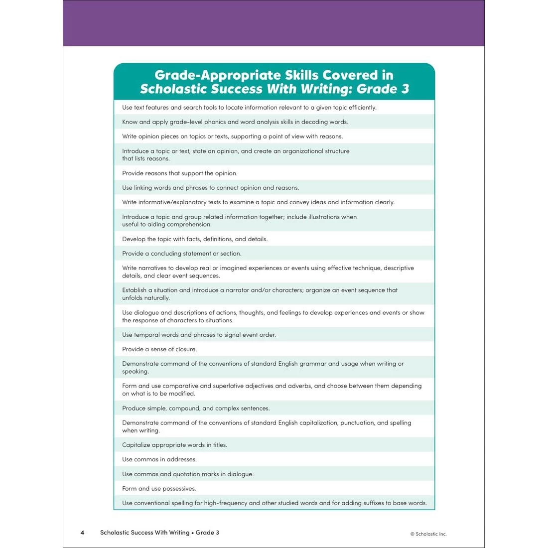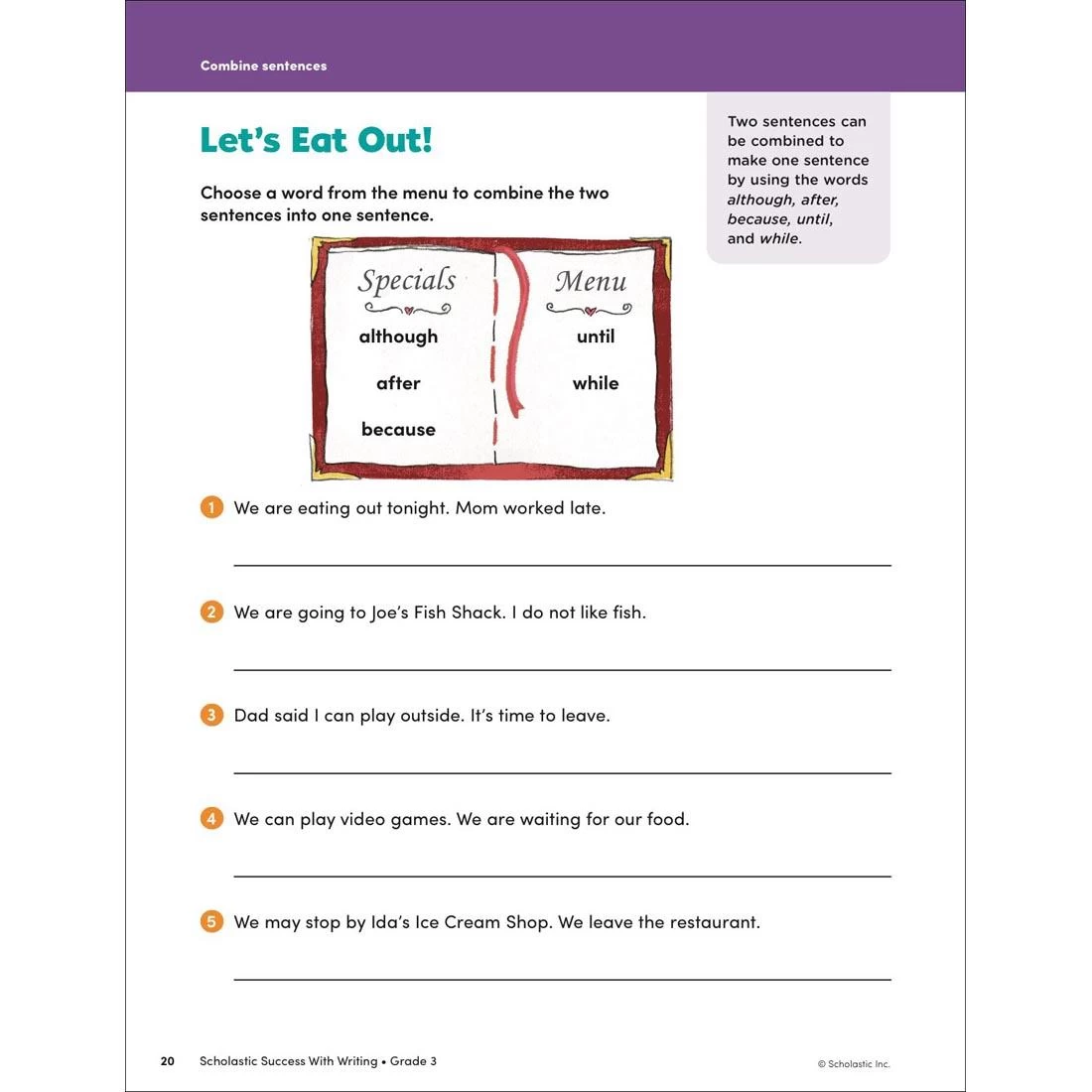 Great for use in the classroom or at home, this workbook includes more than 40 pages of writing practice for students in third grade. Full-color pages feature high-interest topics and engaging exercises. Covers changing fragments to sentences; expanding sentences; combining sentences; building paragraphs; using punctuation; and more. 48 pages.