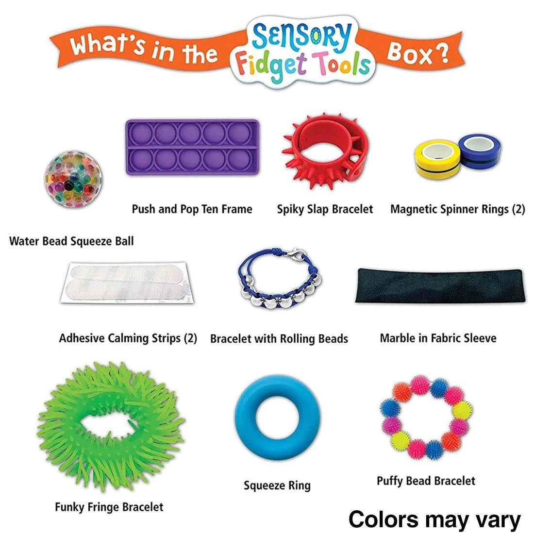 Fidget tools can help reduce stress and anxiety, plus they are great for improving fine motor skills, coordination and dexterity. They can also aid in focus, attention and staying calm, especially for students who have extra energy and hyperactivity. This box features quiet devices that you can stretch, pull, twist, squeeze and more. Includes 2 magnetic spinner rings, 2 adhesive calming strips, and 1 each of fringe bracelet, spiky slap bracelet, puffy bead bracelet, bracelet with rolling beads, squeeze ring, marble in fabric sleeve, water bead squeeze ball, and push & pop ten frame. 12 fidgets in all, designed for ages 4 and up. Colors of items may vary.