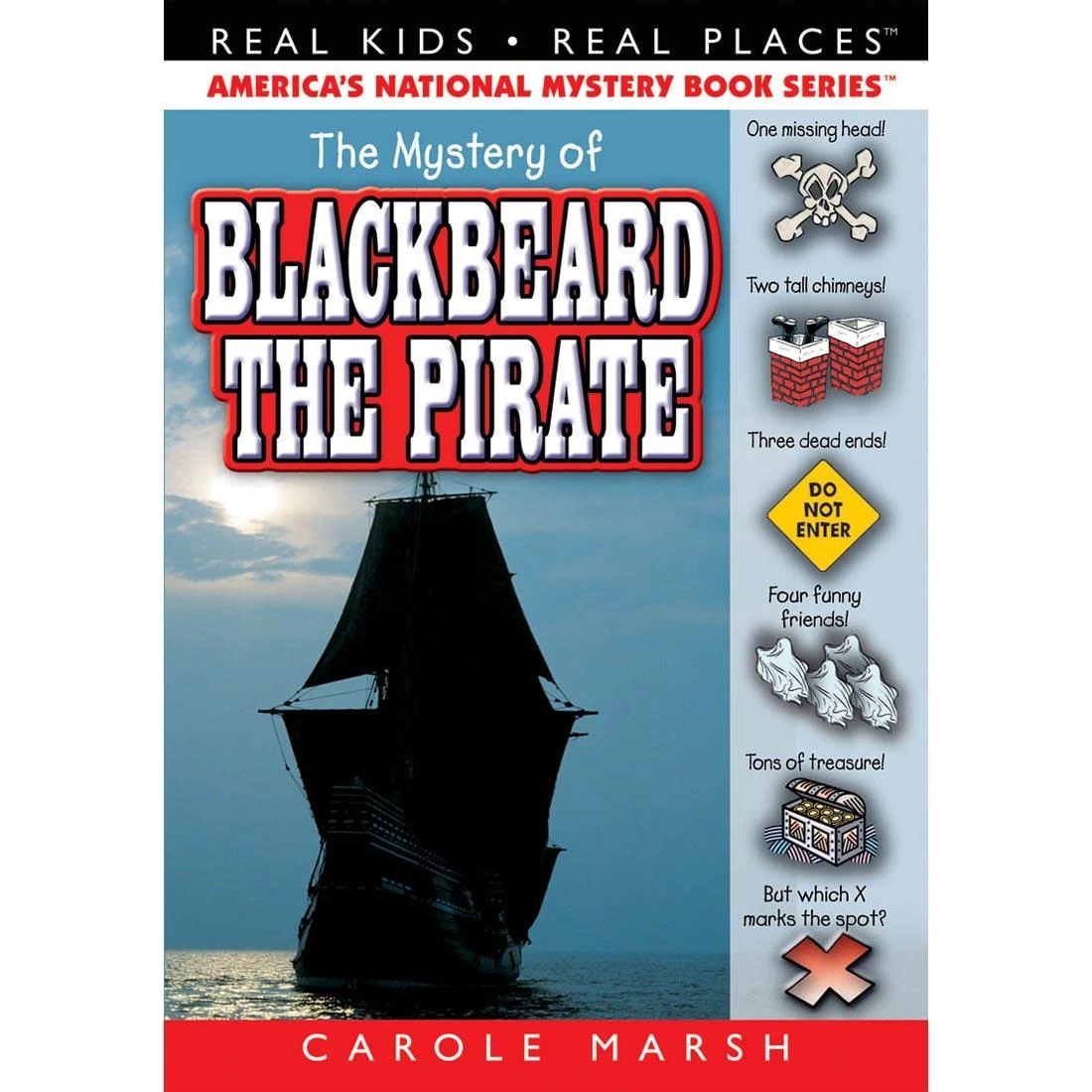 “His head is missing?” Michele asked. “Whose head?” When the answer turns out to be Blackbeard, fiercest pirate of them all, four kids set off on an adventure in North Carolina’s real pirate haunt port town of Bath. While struggling to recover a special prop and save an outdoor drama, the kids learn about the Golden Age of Piracy up and down the American coast from Maine to Florida. They also learn a lot of history, solve a mystery, meet a legend and much more! They have a lot of Jolly Roger laughs! But do they find the treasure? Hmm, would they tell? “Avast! This mystery’s a treasure trove of fun!” This mystery incorporates history, geography, culture and cliffhanger chapters that keep kids begging for more! This mystery includes SAT words, educational facts, fun and humor, built-in book club and activities. This Carole Marsh Mystery also has an Accelerated Reader quiz, a Lexile Level, a Fountas & Pinnell guided reading level and a Developmental Reading Assessment level. Paperback. 160 pages, ages 7-14.