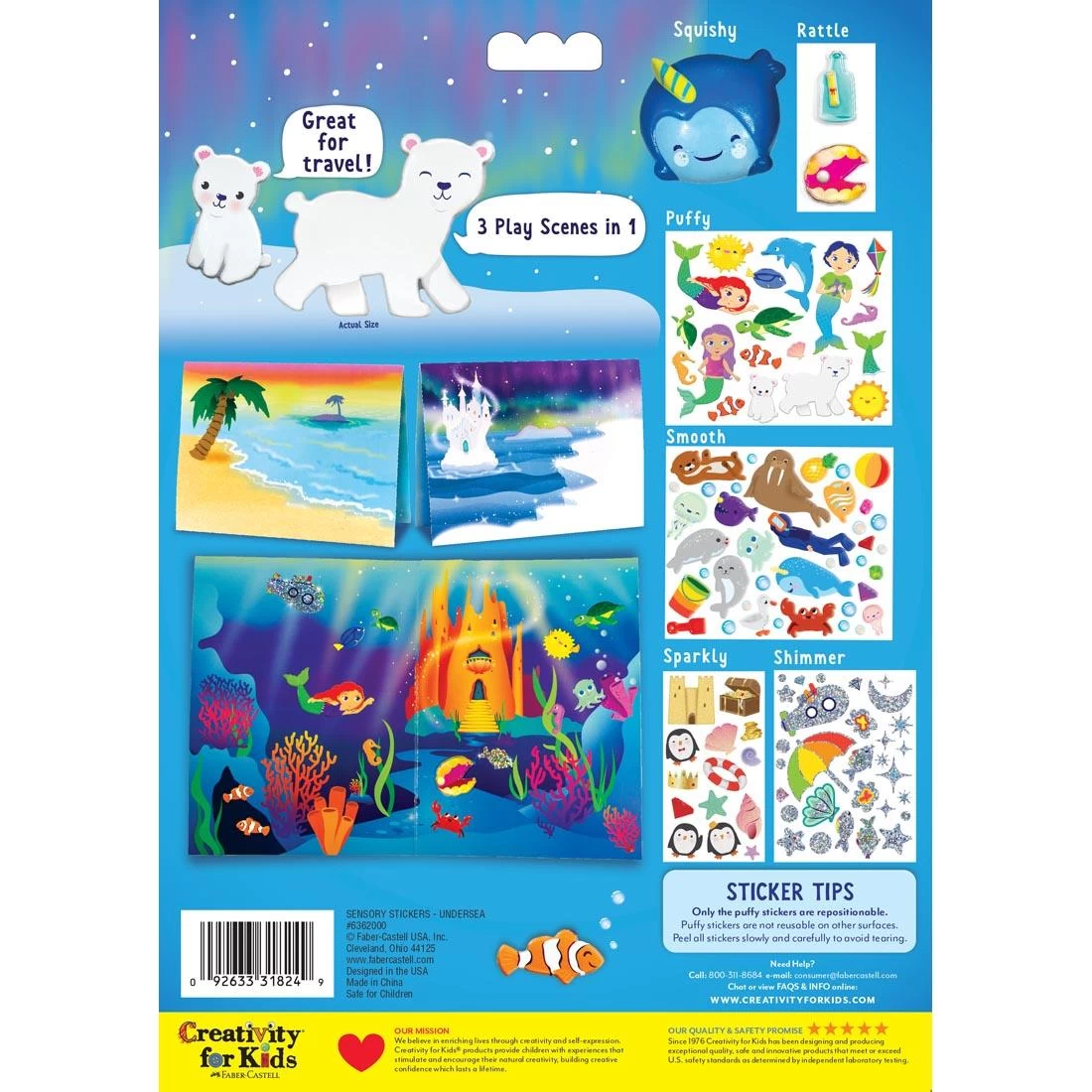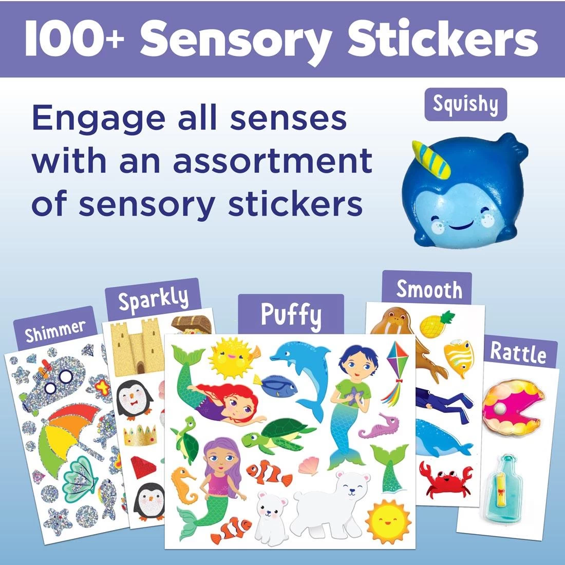 Young children can complete these double-sided play scenes by adding and arranging more than 100 sensory stickers. Special sensory stickers include scented, puffy, sparkly, fuzzy, rattle and smooth; each is designed to engage the senses as kids play. Perfect practice for little fingers, this activity fosters fine motor skills, sensory development and imaginative play. Under the sea theme has 3 different scenes to choose from, and the puffy stickers can be repositioned again and again on the play scenes. For ages 3 and up.