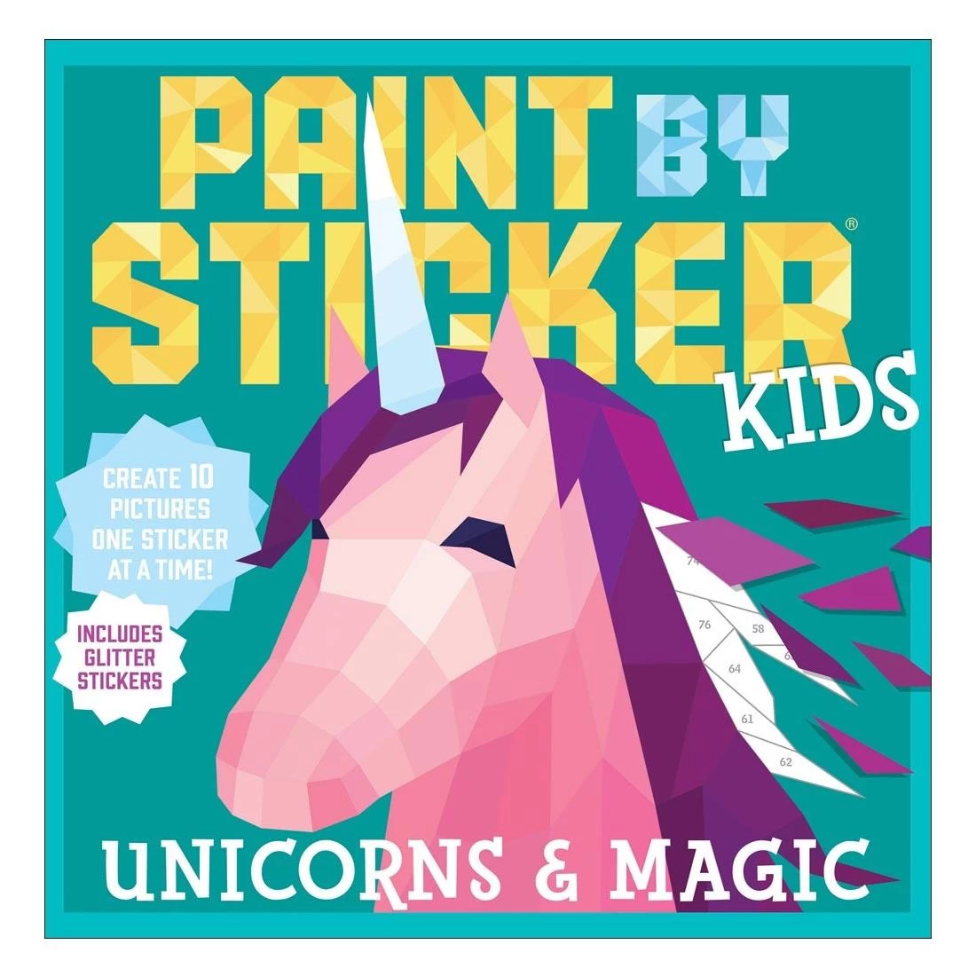The boredom-busting fun of coloring meets the joy of paint by number and the interactive pleasure of a sticker book. Includes everything kids need to create 10 vibrant images, including unicorns, a dragon, a princess and more. As in paint-by-number, each template is divided into spaces, each with a number that corresponds to a particular sticker. Find the sticker, peel it, and place it in the right space. Add the next, and the next, and the next. Watch the “painting” come to life, emerging from a flat black-and-white illustration to a dazzling image with color and body. All the pages are perforated, making it easy to tear out each finished work to frame and share. For ages 5 and up.