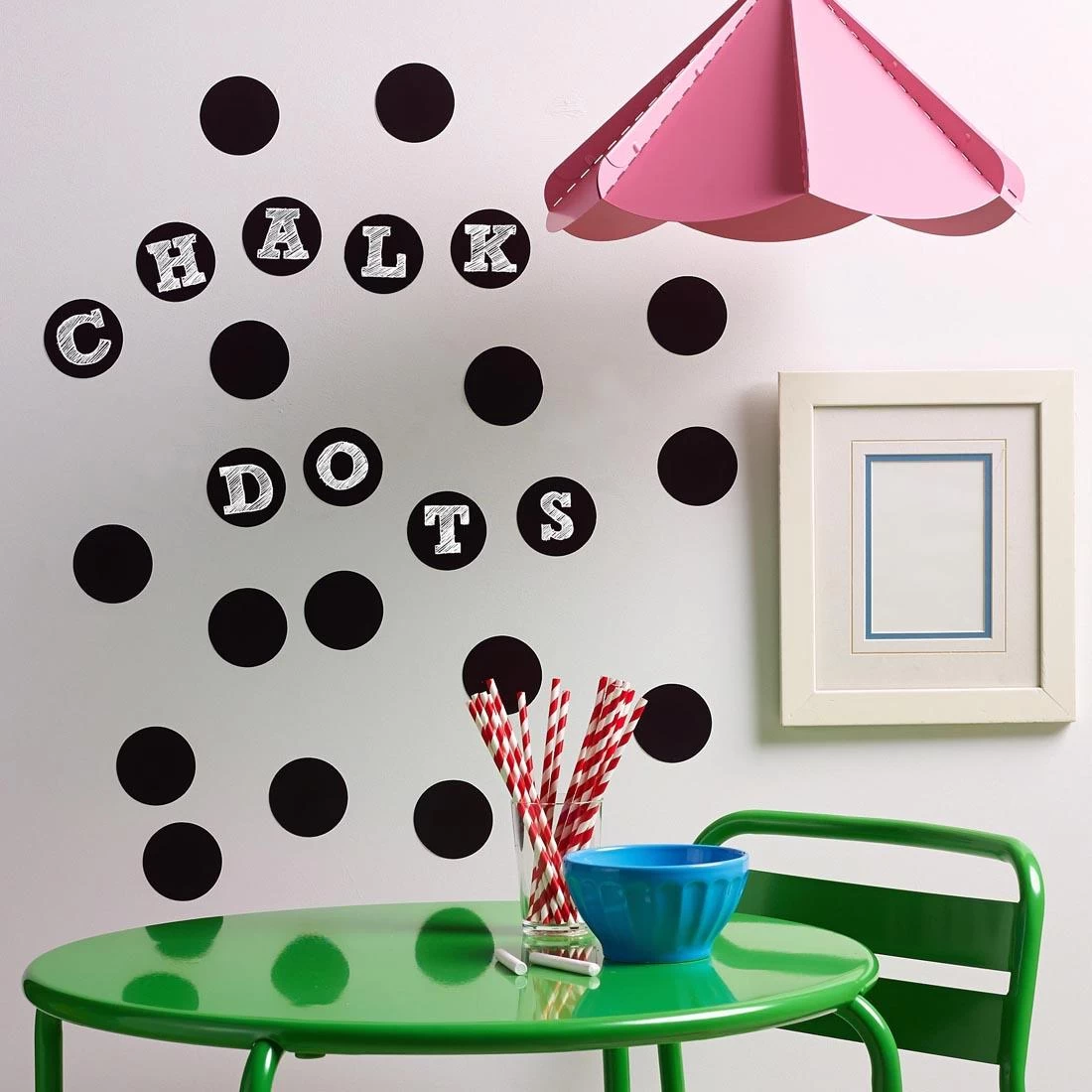 Black, peel and stick chalkboard dots are terrific for educational and decorative purposes. Write on them with the included chalk, then wipe clean with a soft cloth when finished. Removable and repositionable, the peel and stick dots won’t harm most surfaces and leave no sticky residue when removed. Includes 24 dots, each measures 2-3/4″ in diameter.